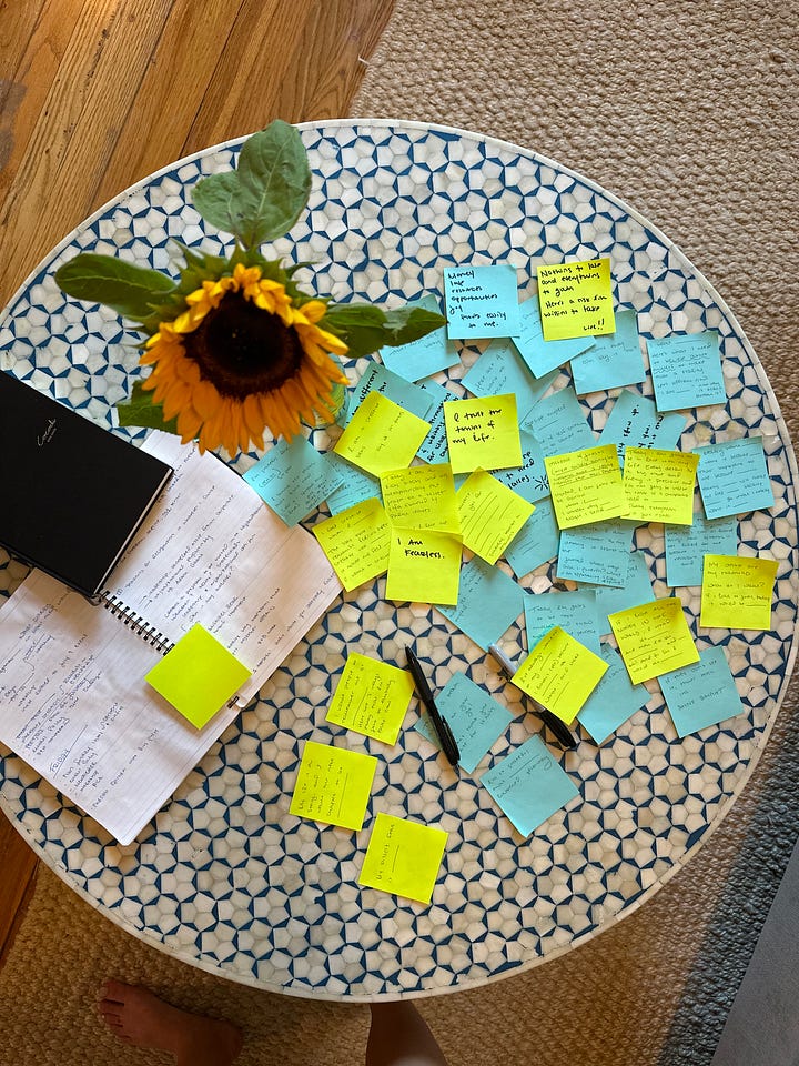 A few weeks later, I revisited the post-its and started to rewrite them into an Excel spreadsheet. I organized them by “journal prompts” — prompts that would spark a writer or person - like you - to open their journal, notebook or diary and begin exploring their inner world of desires and thoughts — and “affirmations” — bold statements, like “I am fearless.” Reminders. Affirmations.