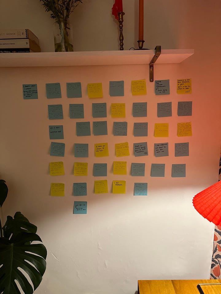In the weeks that followed, I transcribed the scribbles into more legible notes on post-its and pinned them to my wall. I edited them, added to them, removed some that didn’t quite fit the theme that was evolving in front of my eyes.